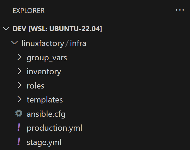 Корневая папка infra, внутри 4 папки: group_vars, inventory, roles, templates + 3 файла ansible.cfg, production.yml, stage.yml.